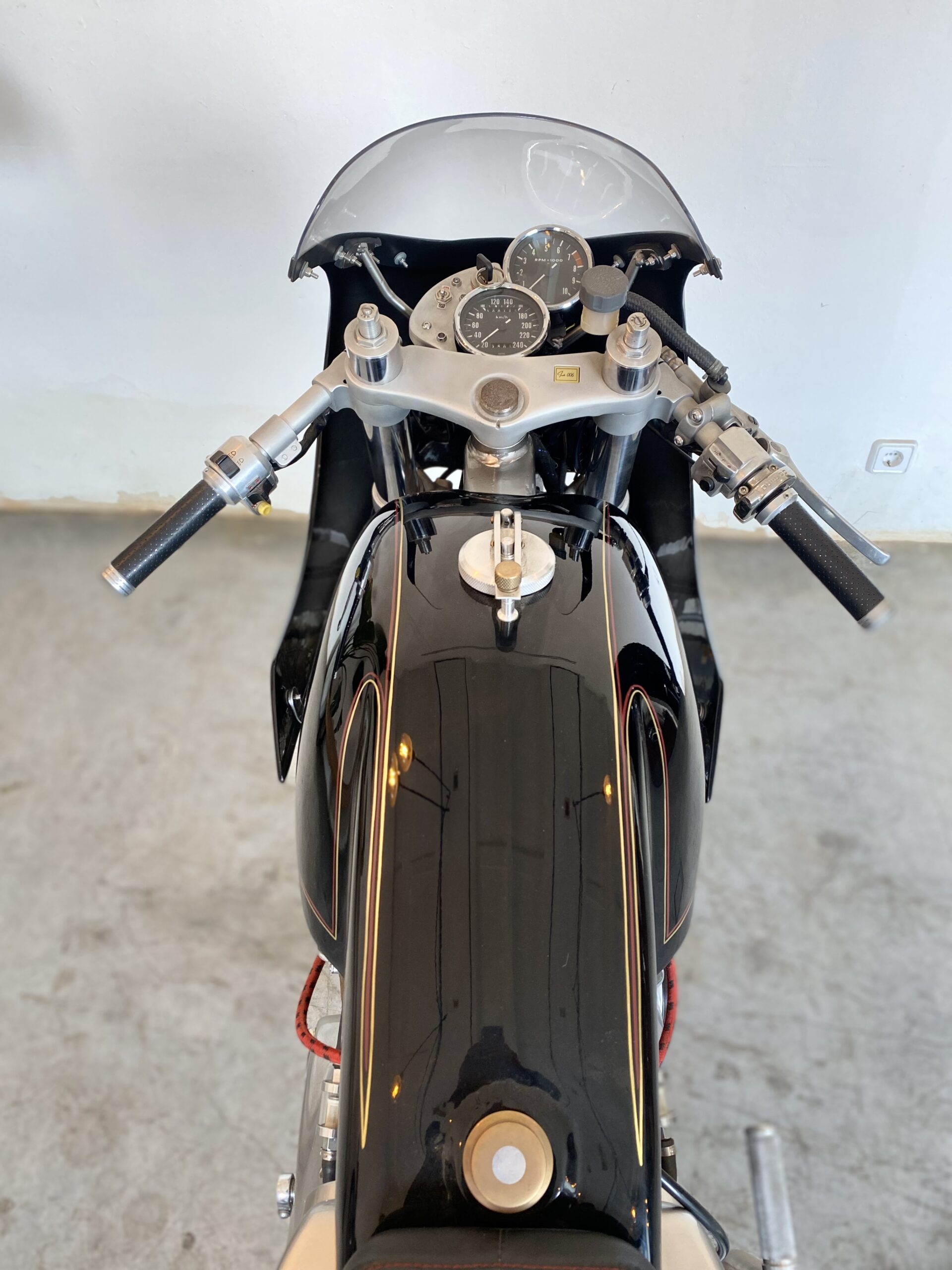 Cada detalle ha sido trabajado a mano: depósito, cúpula, colín y estriberas en aluminio, acabados en un negro brillante perfilado en dorado y granate vino, que aportan un estilo único, elegante y atemporal.